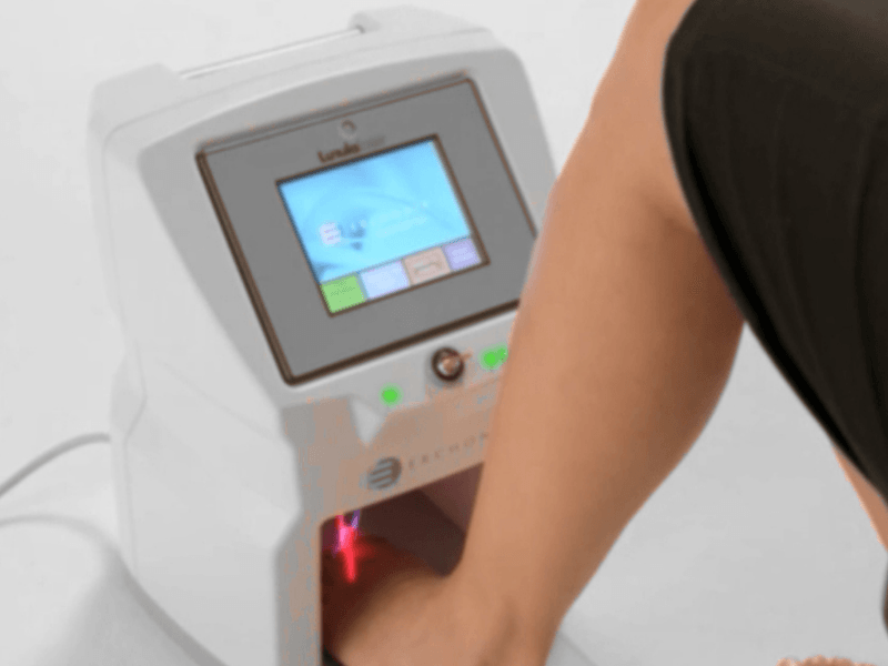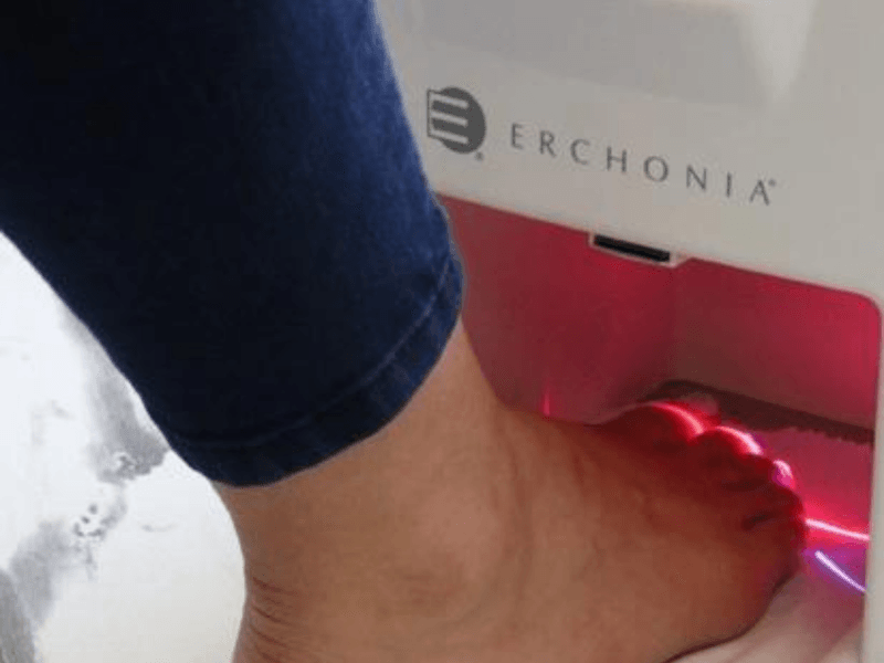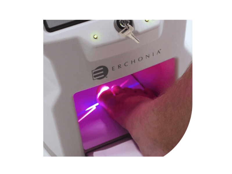 The Lunula cold laser delivers two very low-power laser wavelengths to the feet and nails during treatment.